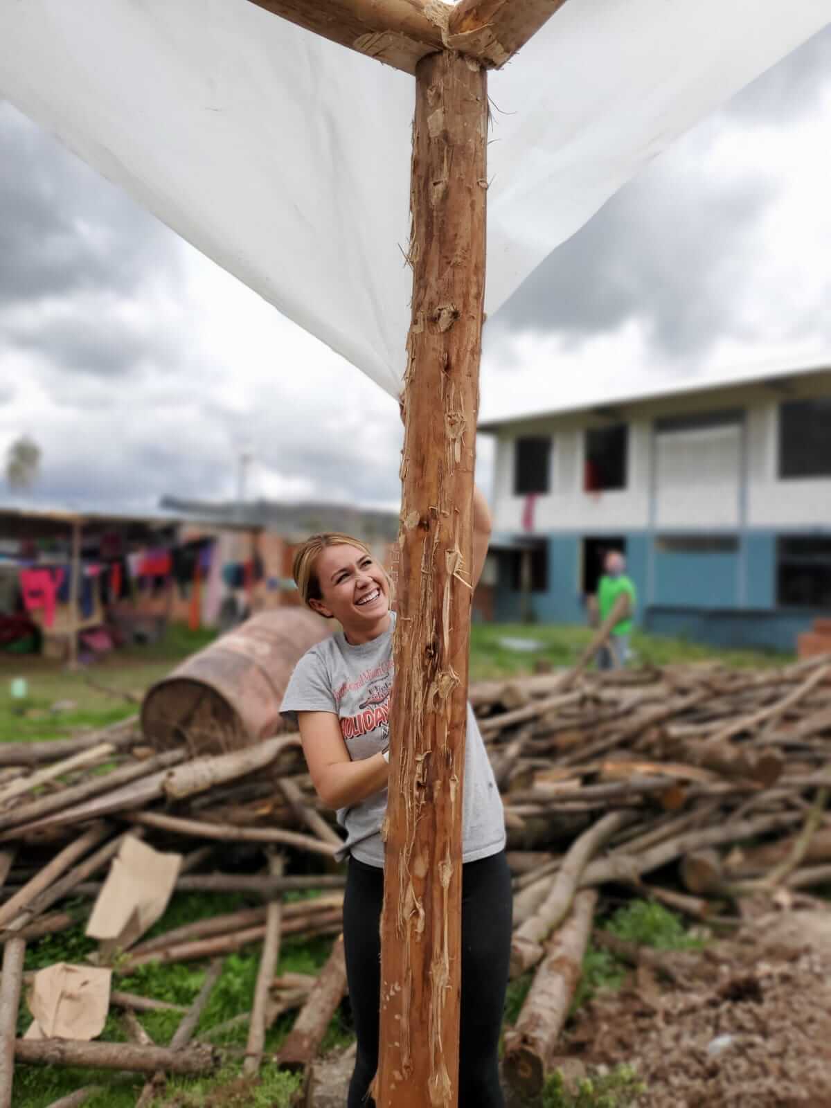 The greenhouse crew also hard a hard job as it was their responsibilities to haul all the eucalyptus posts from where they were stored to the green house out back. This seems like an easy task but they are very heavy and dense. The moxie group made it look simple as they decided they would make it their daily workout instead of the hard work it really was. The green house also included digging all the holes, cementing them in, and also nailing the posts together to make a level area. They also cleared out all of the grass underneath the soon to be planted greenhouse. The final day was exciting as we saw the plastic stretched and cut to fit the giant greenhouse. It finally took shape as the plastic was stretched across the top and everyone took a side and hammered it to the poles.